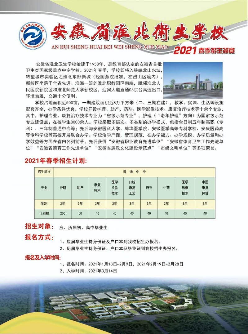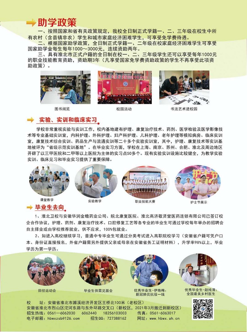 版权所有:安徽省淮北卫生学校 / 地址:安徽省淮北市烈山区沱河东路 / 招生电话:0561-6062440、6062030 / 校办公电话:0561-6062754