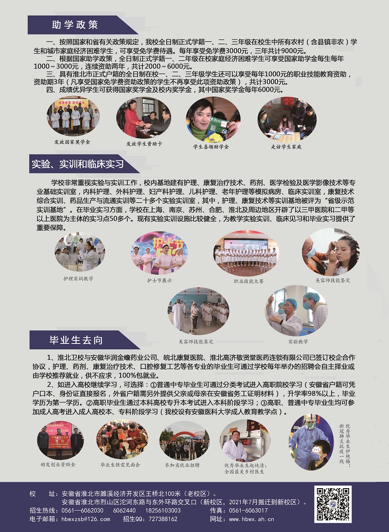 版权所有:安徽省淮北卫生学校 / 地址:安徽省淮北市烈山区沱河东路 / 招生电话:0561-6062440、6062030 / 校办公电话:0561-6062754