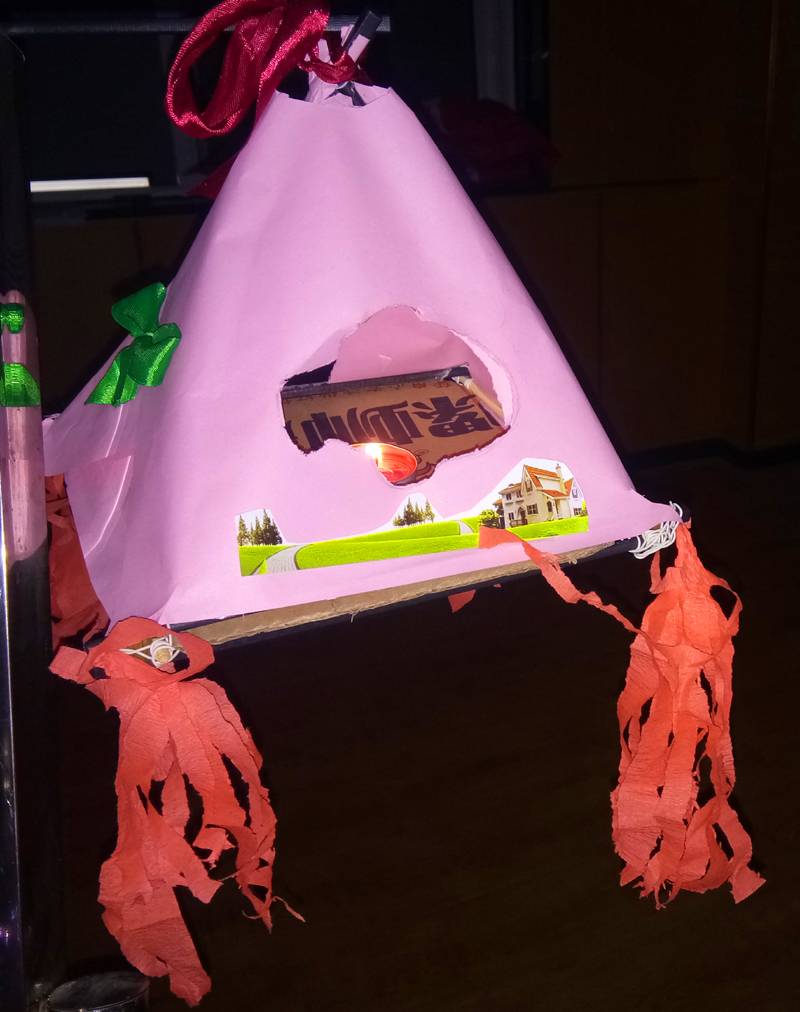 活动中,学生齐心协力、集思广益,在指导教师的帮助下手工制作出一件件形态各异的灯笼作品,有的创意独特,从作品中可以看出,绝大多数都是利用生活中一些常见的环保材料物品,如:树叶、筷子、彩纸、塑料瓶、饮料罐、毛线等进行合理利用,通过剪、贴、涂、绕等技巧,制作成各种灯笼。有的学生充分利用校园凋落树叶,发挥想象制作了心愿树,利用树枝糊纸灯笼,普通纸折出灯笼,并创造性用手机电筒代替蜡烛做照明。
