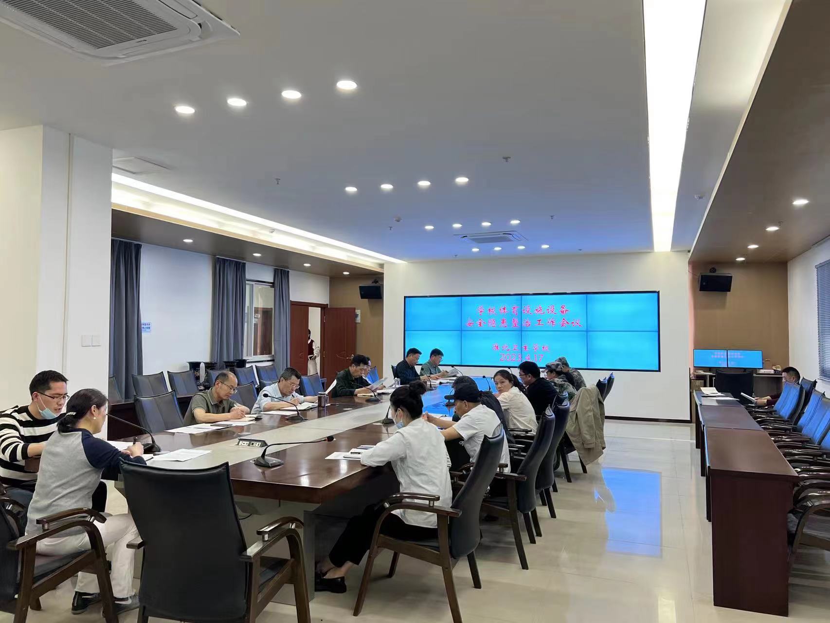 2023年4月17日下午,淮北卫校召开学校体育设施设备安全隐患排查整治工作会议。校领导、相关科室负责人、保洁公司、教官队代表、食堂各窗口负责人近20人参加了会议。