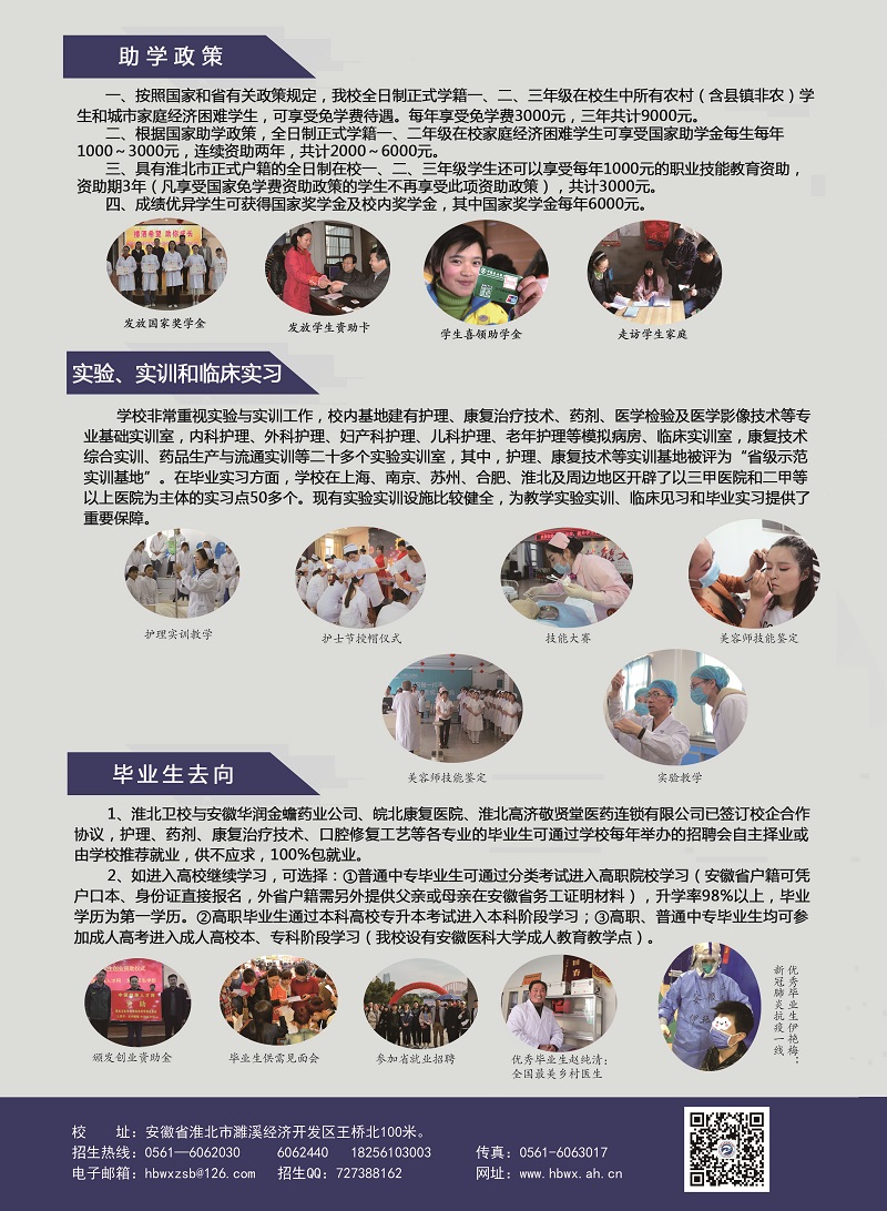 版权所有:安徽省淮北卫生学校 / 地址:安徽省淮北市烈山区沱河东路 / 招生电话:0561-6062440、6062030 / 校办公电话:0561-6062754