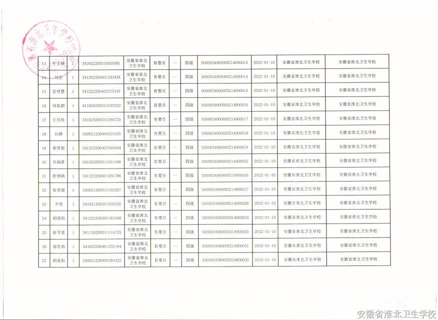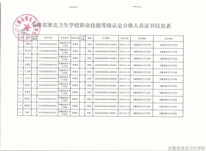 2021年12月29日在淮北卫生学校举行了育婴员四级技能等级认定考试,共35人参加认定考试,通过人数为32人,现公示通过人员名单,公示时间为2022年1月10日至2022年1月14日,公示期为5个工作日。