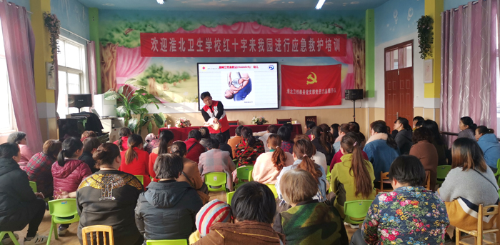 3月20日,淮北卫生学校红十字会来到濉溪县临涣中心幼儿园,由国家级应急救护培训师王志远同志担任主讲,为该园全体教职工和学生家长开展了现场应急救护专题培训。
