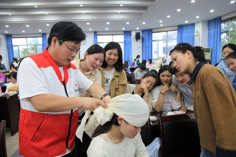 本届救护培训是淮北市红十字会、淮北卫校联合组织安排的应急救护培训项目,按照安徽省红十字会相关要求,主要围绕红十字会基本知识、救护新概念、心肺复苏术(CPR)、创伤救护(止血、包扎、骨折固定、伤员搬运等)、意外伤害的急救处理与避险和常见急症的现场救护等展开讲解,并进行模具示范演示。在培训现场,学员参与踊跃,师生积极互动,教学效果良好,模拟急救现场,通过亲自实施心肺复苏术、创伤救护止血、包扎、搬运等技能操作,进一步巩固了所学专业知识,掌握了现场急救的基本技能。参训学生们一致表示,这次培训有意义很实用,当遇见意外伤害时,可以进行简单的紧急救护,为今后更好地救助突发事件现场的伤者积累了宝贵经验。