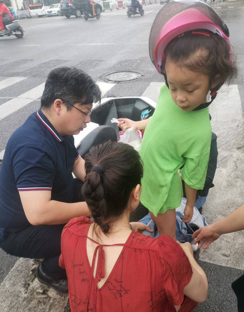 6月18日早晨,淮北卫生学校教务支部书记、校红十字会副秘书长王志远驱车前往单位,行驶至濉溪县淮海路与碱河路口时,发现前方一起交通事故,隐约看到有人受伤,发现一辆电动车倒在地上,旁边坐着一位女士,用手扶着右腿,身边站一位大约6岁的女孩,一直在哭泣。