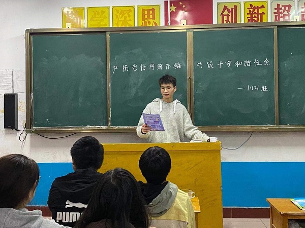 最近防诈骗诈骗频频出现,为了防止不法分子对在校学生进行诈骗活动以及危害到在校大学生的生命及财产安全,2020年11月17日,我校举行 “防网络诈骗”安全教育主题班会。